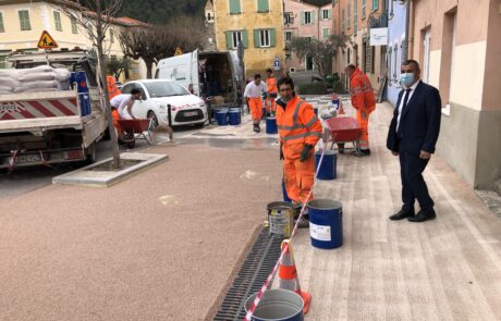 M. le Maire s’est rendu ce jeudi 3 mars 2021, sur le chantier de reprise de la résine de la place Maiffredi au droit des Commerces.