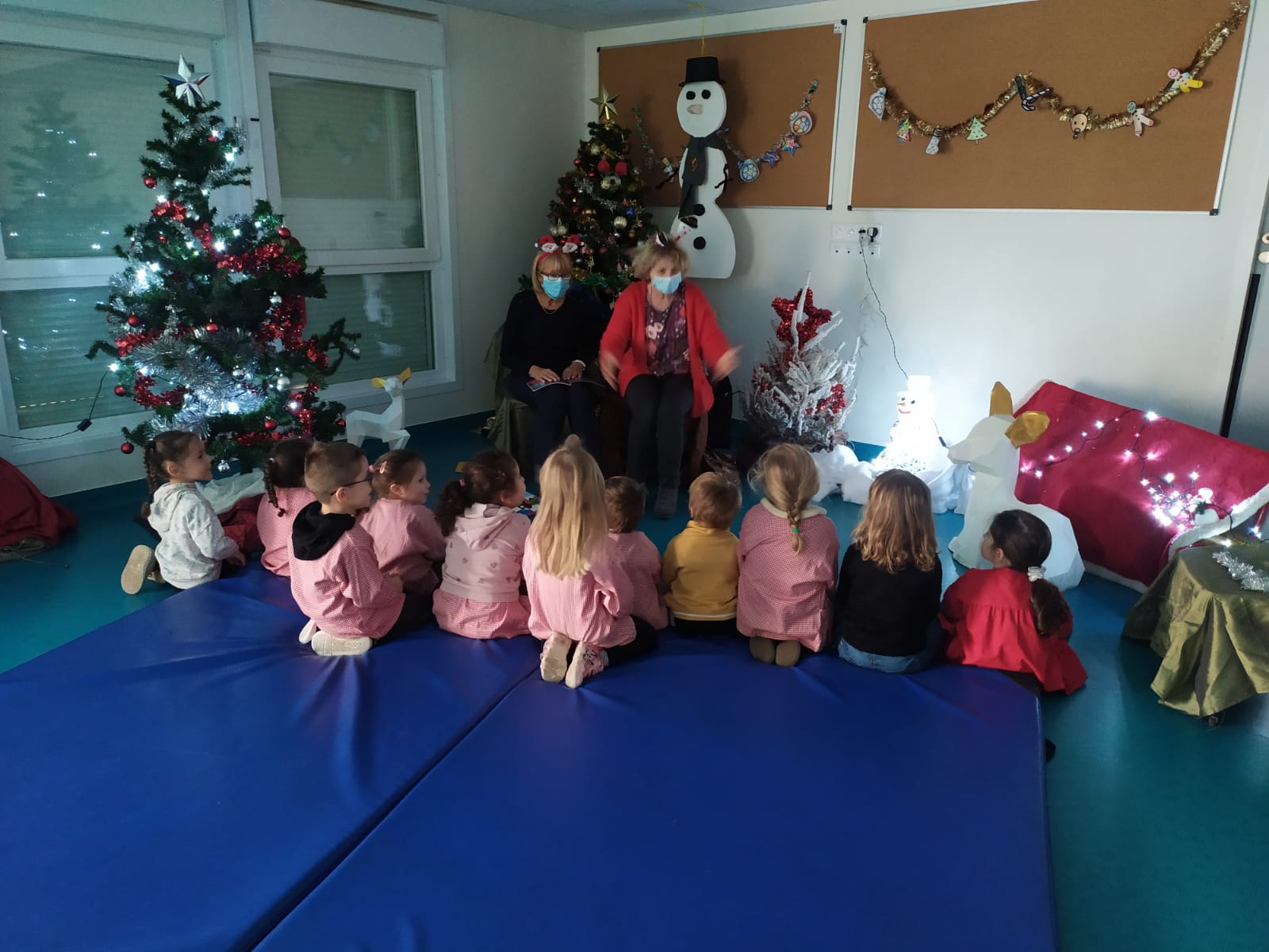 Dans l’ambiance calfeutrée d’une salle de motricité décorée pour l occasion les enfants ont pu écouter et interagir par petits groupes de 10 autour de ces contes féeriques. Après avoir écoutés les histoires, les enfants ont spontanément chanté les chansons de Noël apprises en classe.
